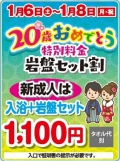 20歳おめでとう割(入浴+岩盤浴セット割引) 2024年1月6日(土)~8日(月・祝) 20歳をお祝いして、20歳の方ご本人は 入浴+岩盤浴セット 通常1,770円⇒平日1,100…